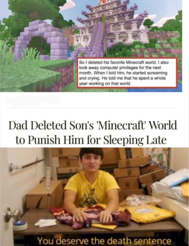 Although quite late I take a look and give my thoughts on this Reddit post where a father deletes his sons Minecraft project which took him a year to make as punishment for what seemed like a little. So I followed through with my warning and went on the computer and deleted his favorite Minecraft world. 6152020 steve party Guild Master Joined Oct 4 2019 Messages 1624 Reactions.