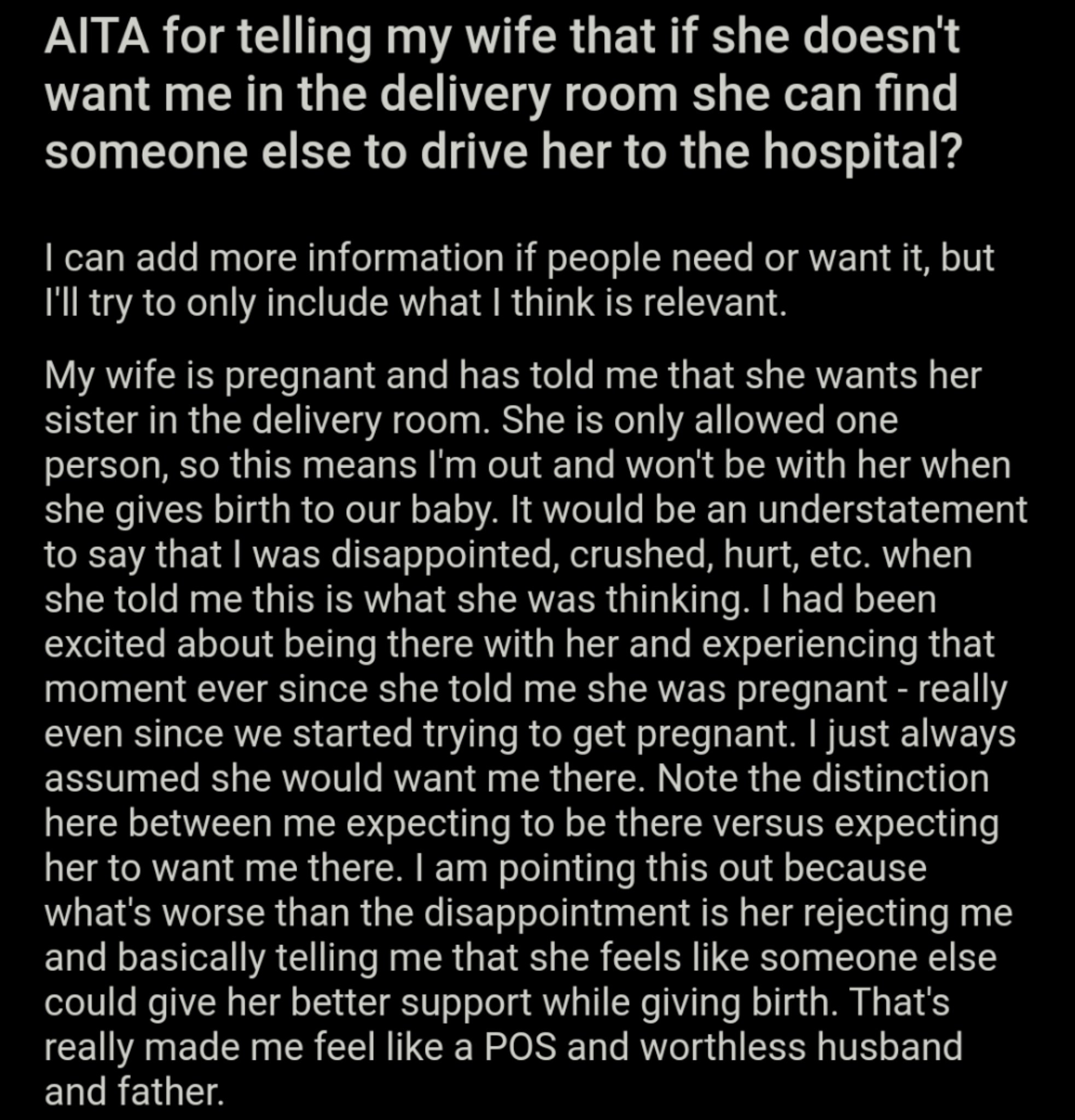 Am I The Asshole On Twitter Aita For Telling My Wife That If She Doesn T Want Me In The Delivery Room She Can Find Someone Else To Drive Her To The Hospital
