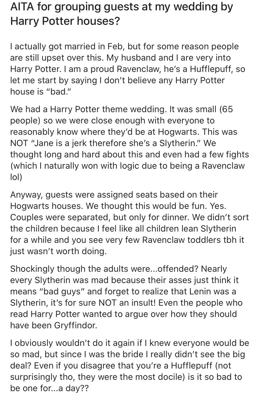 Aita For Sorting My Wedding Guests Into Harry Potter Houses Except For The Kids Of Course That Would Be Ridiculous Bookscirclejerk