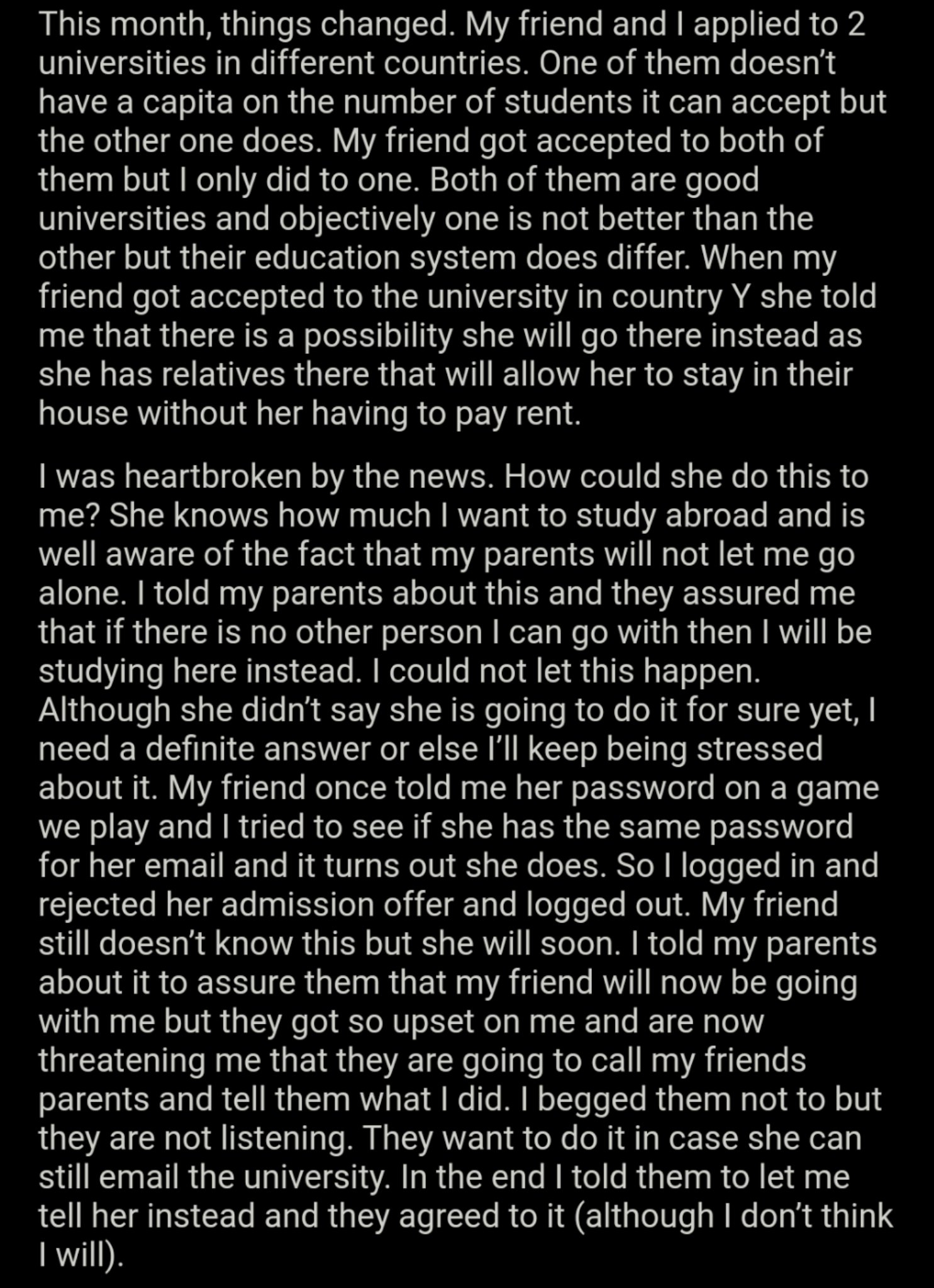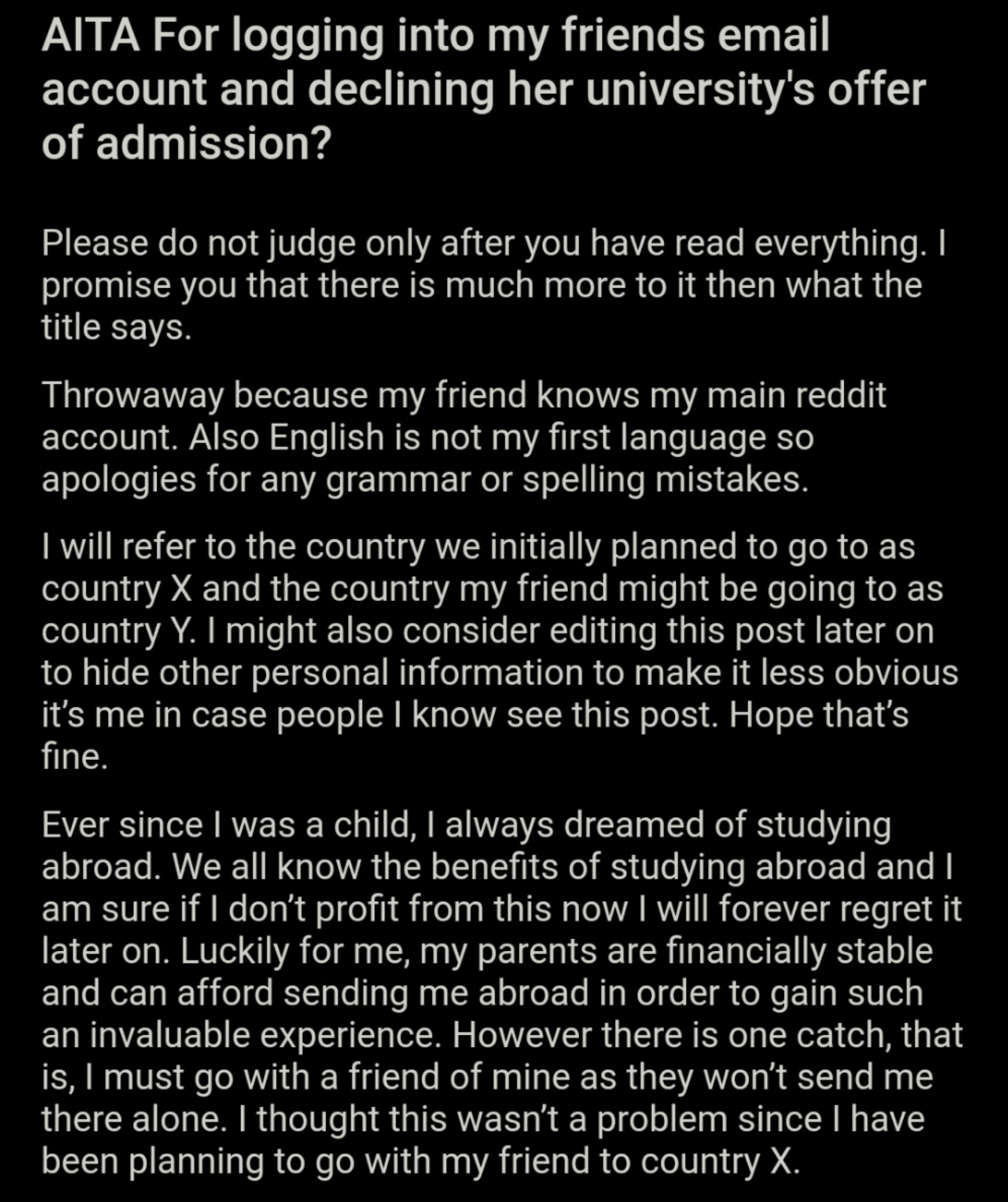 Am I The Asshole On Twitter Aita For Logging Into My Friends Email Account And Declining Her University S Offer Of Admission Https T Co Gd1lvmn78t Https T Co Jjzqq6m1or