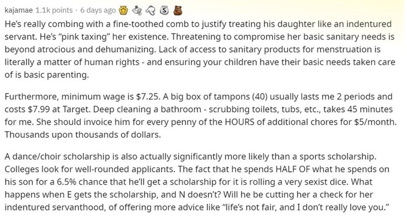 One mother engaged in an ongoing conflict with her daughter to the Am I The Ahole AITA subReddit for personal validation. A 50-year-old father reached out to fellow Redditors to ask if he was wrong to ask his daughter to do daily chores in exchange for her monthly need for pads and tampons. Thats the case with this story from uThrowAwayGirlVsBoy who wrote AITA for expecting my daughter to do chores He says hes a 50-year-old dad whose wife passed away ten years ago.