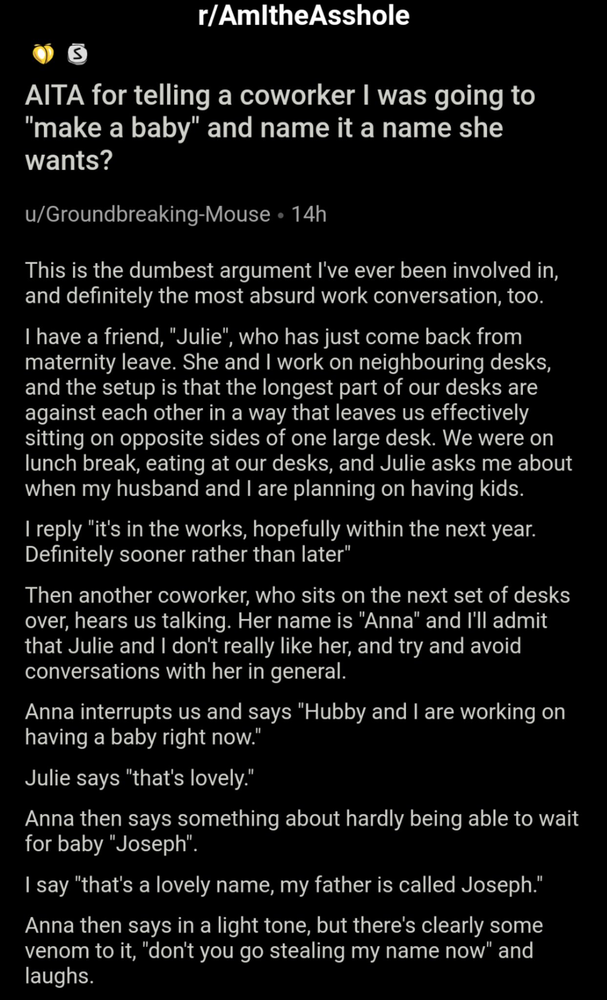 Am I The Asshole On Twitter Aita For Telling A Coworker I Was Going To Make A Baby And Name It A Name She Wants Https T Co Cwqeyk14ny