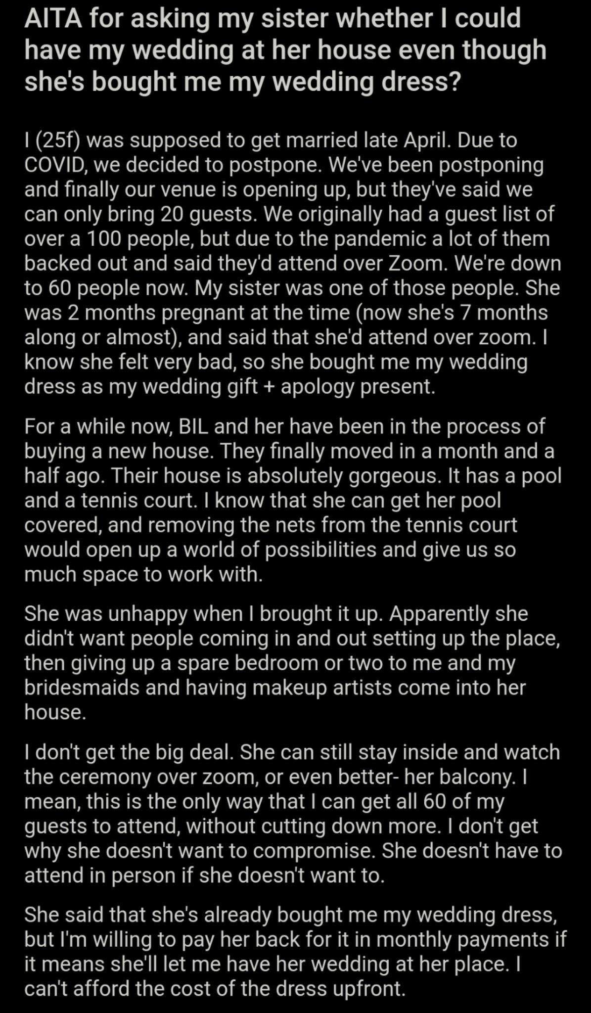 Am I The Asshole On Twitter Aita For Asking My Sister Whether I Could Have My Wedding At Her House Even Though She S Bought Me My Wedding Dress Https T Co U9xy8ky4vb Https T Co 5lymogtkrk