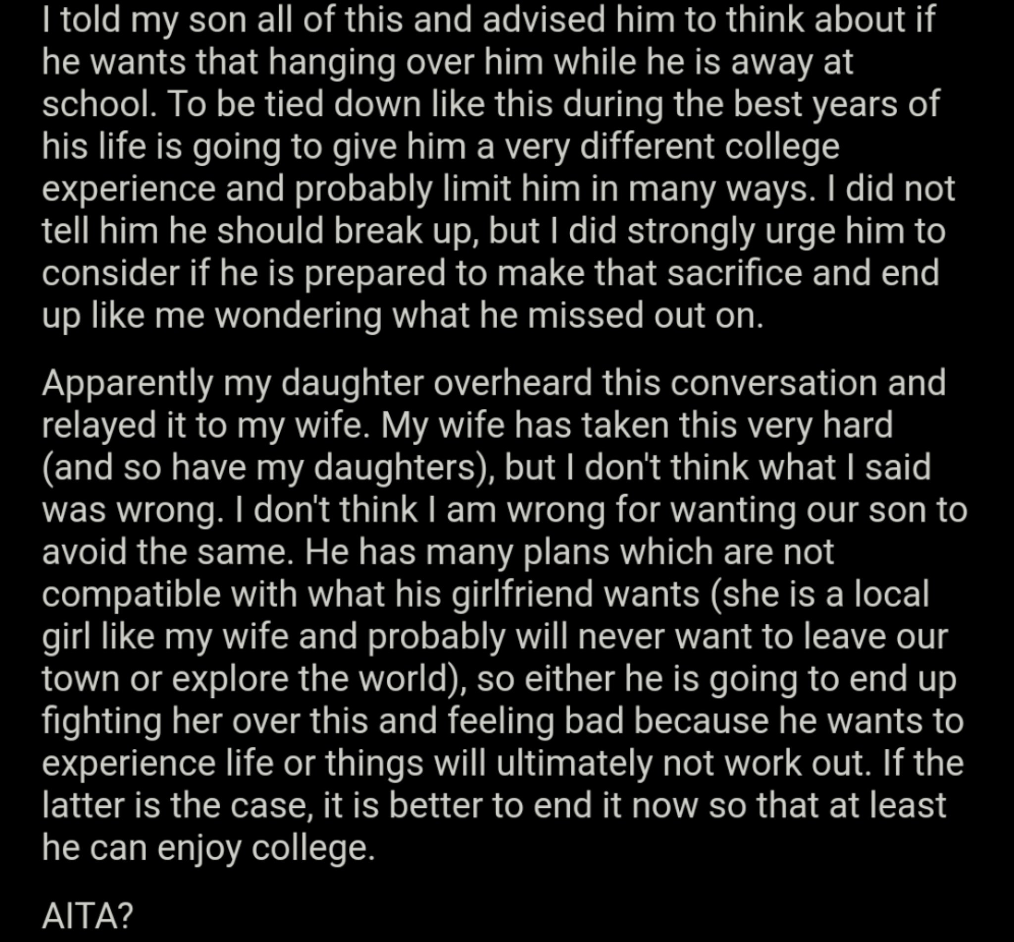 Am I The Asshole On Twitter Aita For Possibly Encouraging My Son To Break Up With His Girlfriend And Telling Him I Have Regrets About Marrying His Mother My Wife Https T Co Gahtvmnakf Https T Co Pblgnfkmoc