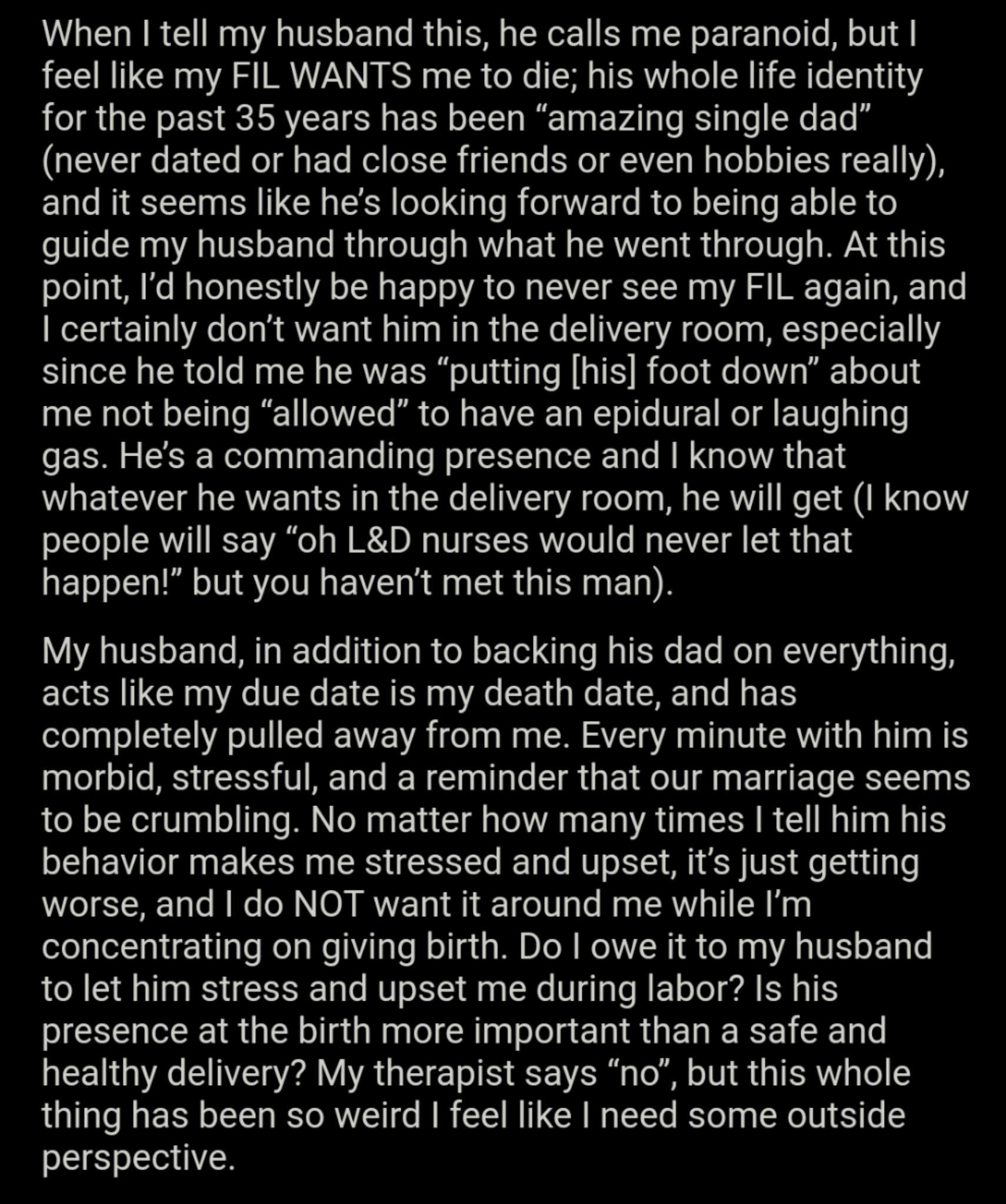 1292020 morbidmommy11Reddit and Cavan ImagesGetty This pregnant womans husband and father-in-law will not stop obsessing over the idea that she will die during childbirth. He showed up to the wedding on the basis of a fake invite.